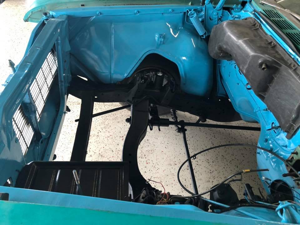 That engine and a yet to be purchased Passon Performance 5-Speed 833 will be installed. The car will be wrapped to look like Richard Petty took his NASCAR from 1960 after the season and drag it out back to let 58 years of weather beat it up. This brings me to what was recently done, and that was to paint the engine compartment Petty Blue before the engine goes in. The front end was also rebuilt last week.